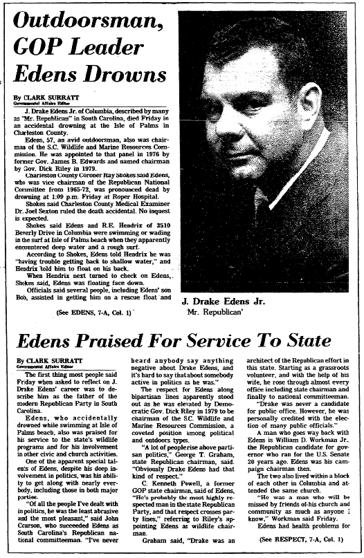 J. Drake Edens, Jr. of Columbia, described by many as “Mr. Republican” in South Carolina, died Friday in an accidental drowning at the Isle of Palms in Charleston County.