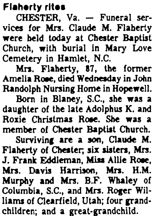 Surviving are a son, Claude M. Flaherty of Chester; six sisters, Mrs. J. Frank Eddleman, Miss Allie Rose, Mrs. Davis Harrison, Mrs. H. M. Murphy and Mrs. B. F. Whaley of Columbia, S. C., and Mrs. Roger Williams of Clearfield, Utah; four grandchildren; and a great-grandchild.