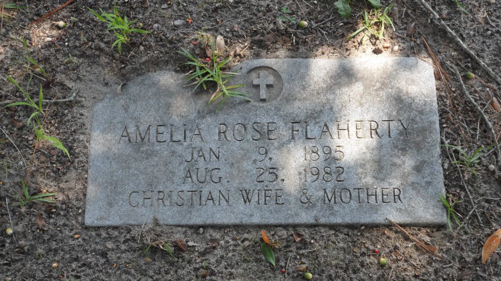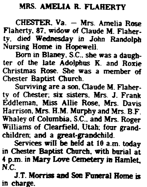 Amelia Rose Flaherty was born January 9, 1895 in Elgin, South Carolina, the daughter of Adolphus K Rose and Roxie Christmas Rose.