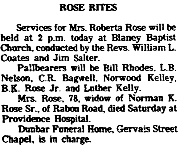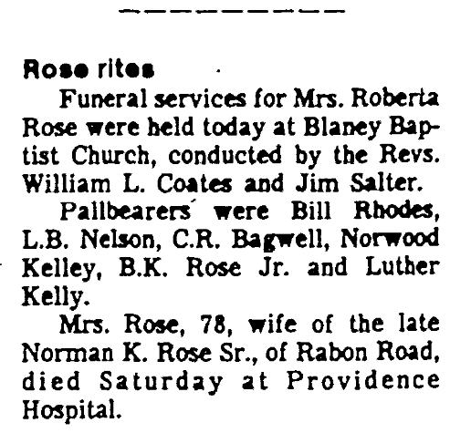 Funeral services for Mrs. Roberta Rose were held today, September 6, 1982 were held today at Blaney Baptist Church, conducted by the Revs. William L. Coates and Jim Salter.