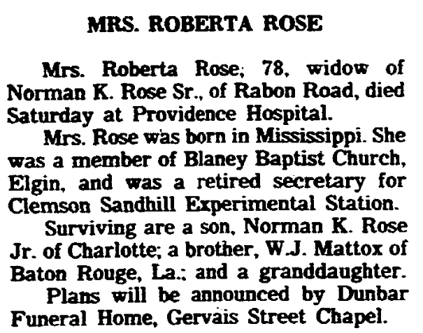 Mrs. Rose was born in Mississippi. She was a member of Blaney Baptist Church, Eglin, and was retired secretary for Clemson Sandhill Experimental Station.