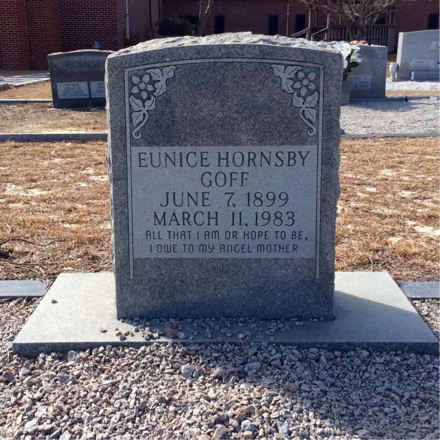 On August 15, 1994, Eunice Hornsby Goff was listed as the deceased mother in the obituary of Mendel J. “Wimpy” Goff.