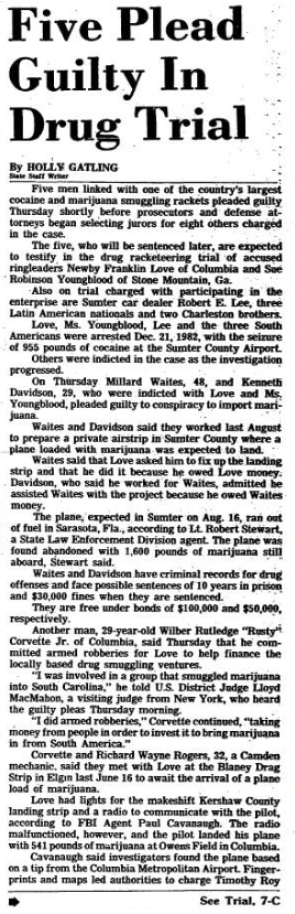 Love, Ms. Youngblood, Lee and the three South Americans were arrested Dec. 21, 1982, with the seizure of 955 pounds of cocaine at the Sumter County Airport.
