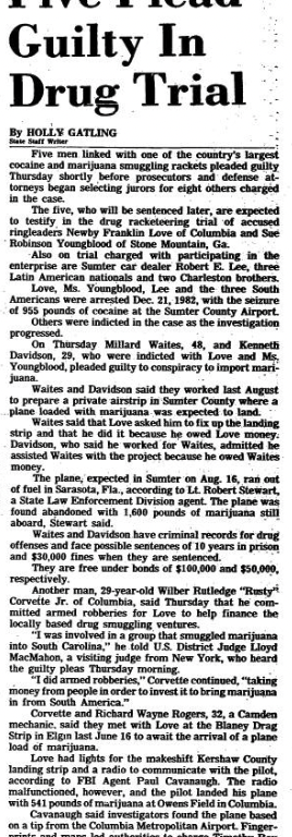 Love, Ms. Youngblood, Lee and the three South Americans were arrested Dec. 21, 1982, with the seizure of 955 pounds of cocaine at the Sumter County Airport.