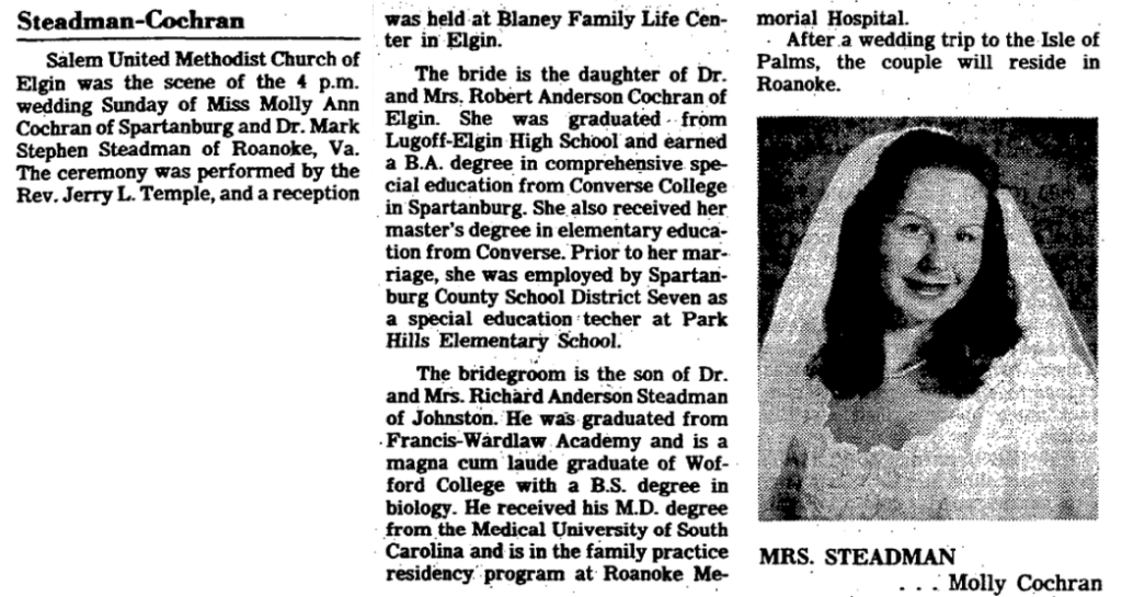 Salem United Methodist Church of Elgin was the scene of the 4 p.m. wedding Sunday of Miss Molly Ann Cochran of Spartanburg and Dr. Mark Stephen Steadman of Roanoke, Va. The ceremony was performed by the Rev. Jerry L. Temple, and a reception was held at Blaney Family Life Center in Elgin.