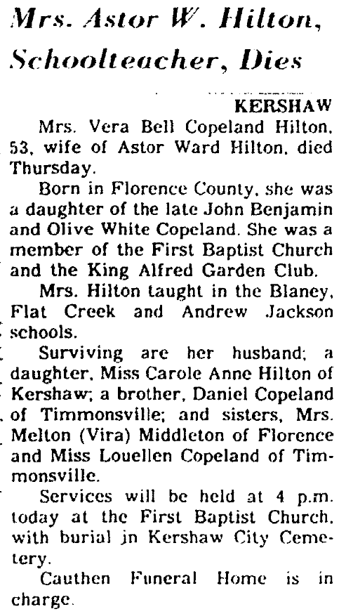 Surviving are her husband; a daughter, Miss Carole Ann Hilton of Kershaw; a brother, Daniel Copeland of Timmonsville; and sisters, Mrs. Melton (Vira) Middleton of Florence and Miss Louellen Copeland of Timmonsville.