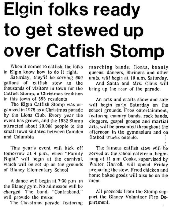 The Elgin Catfish Stomp was organized in 1975 as a Christmas parade by the Lions Club. Every year the event has grown, and the 1982 stomp attracted about 20,000 people to the small town situation between Camden and Columbia.