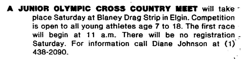 Sports A JUNIOR OLYMPIC CROSS COUNTRY MEET will take place, Saturday at Blaney Drag Strip in Elgin. Competition is open to all young athletes age 7 to 18. The first race will begin at 11 AM. There will be no registration Saturday. For information call Diane Johnson at (1) 438–2090. Continue reading Calendar