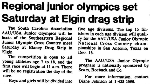 The South Carolina Association AAU/USA Junior Olympics will be hosts of the Southeastern Regional Junior Olympic Cross Country meet Saturday at Blaney Drag Strip in Elgin.