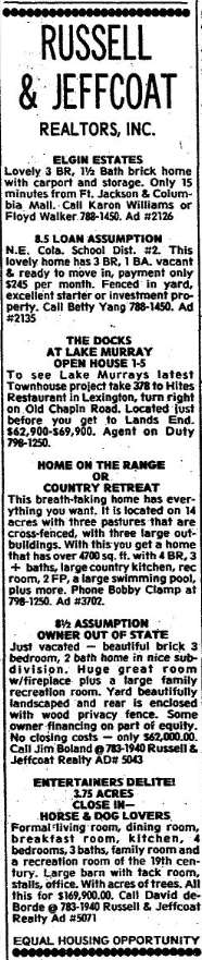 Lovely 3 BR, 1½ Bath brick home with carport and storage. Only 15 minutes from Ft. Jackson & Columbia Mall. Call Karon Williams or Floyd Walker. 788-1450. Ad #2126