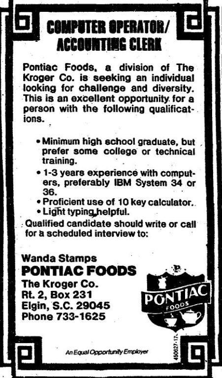 • 1-3 years experience with computers, preferably IBM System 34 or 36.
