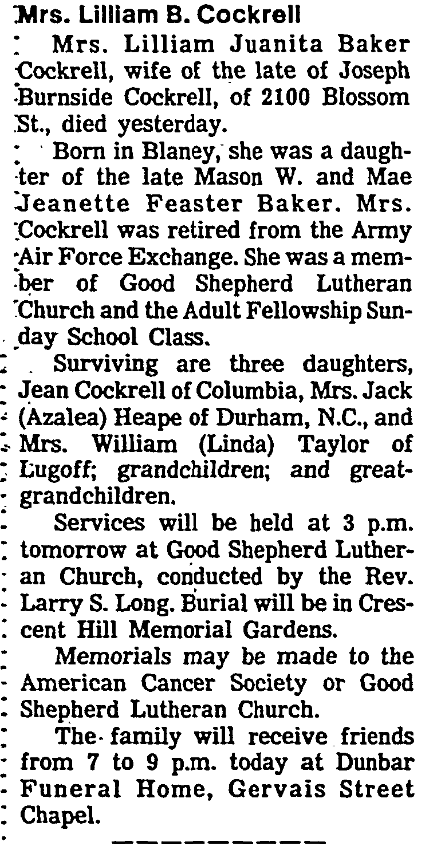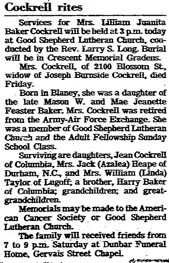 Surviving are daughters, Jean Cockrell of Columbia, Mrs Azalea Cockrell (Jack) Heape of Durham, NC, and Mrs Linda Cockrell (William) Taylor of Lugoff, grandchildren and great grandchildren.