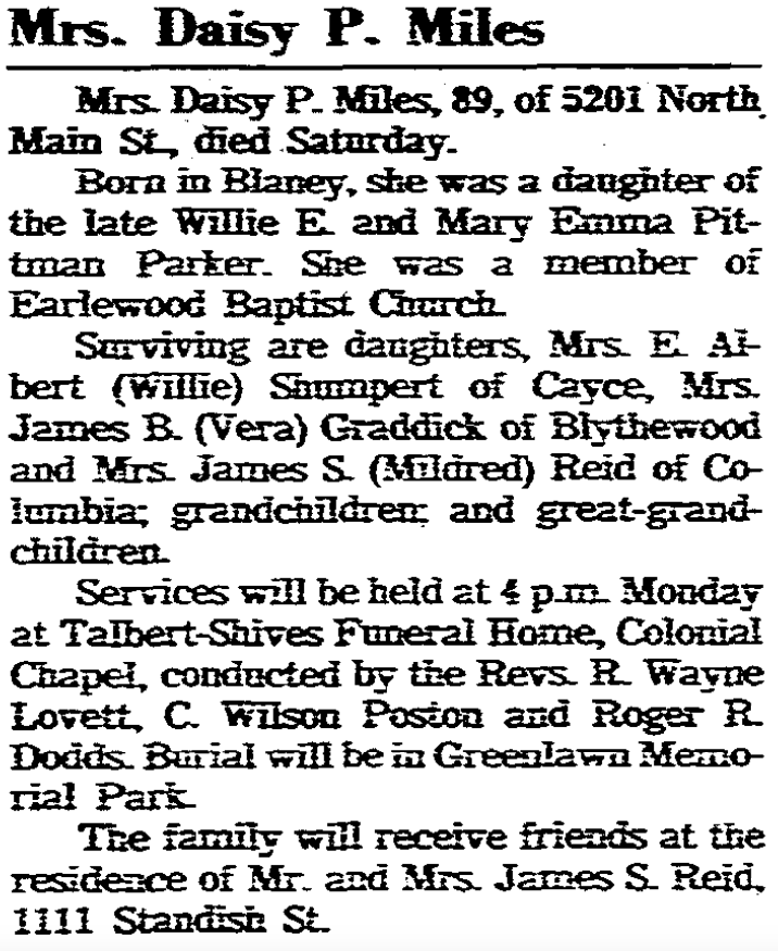 Surviving are daughters, Mrs. E. Albert (Willie) Shumpert of Cayce, Mrs. James B. (Vera) Graddick of Blythewood and Mrs. James S. (Mildred) Reid of Columbia; grandchildren and great-grandchildren.