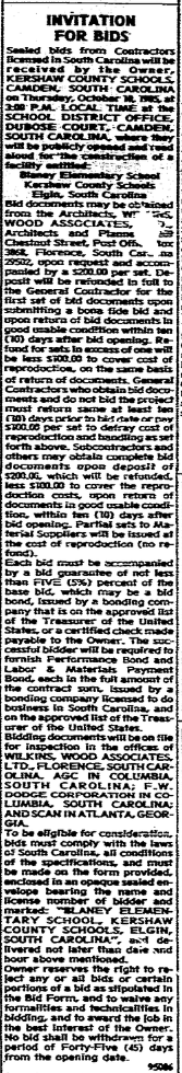 Sealed bids from Contractors licensed in South Carolina will be received by the Owner, KERSHAW COUNTY SCHOOLS, CAMDEN, SOUTH CAROLINA, on September 24, 1985, at 3:00 P.M. LOCAL TIME at the SCHOOL DISTRICT OFFICE, DUBOSE COURT, CAMDEN, SOUTH CAROLINA, where they will be publicly opened and read aloud for the construction of a facility entitled: