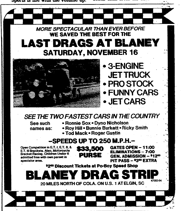 Open Competition in E. T. I., E. T. II & E. T. III Brackets. Also, Motorcycle Bracket Racing Children Under 6 admitted free with own parent in spector area.