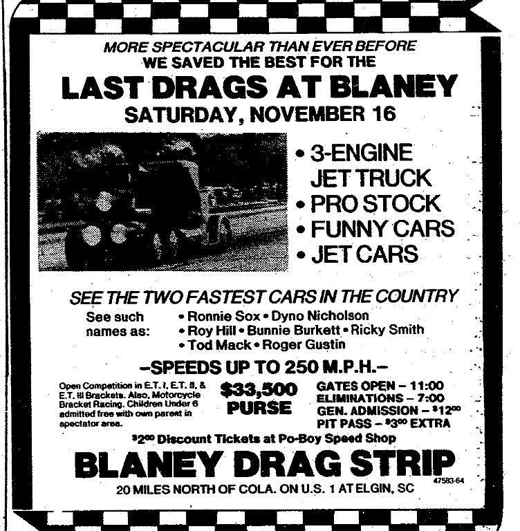 Open Competition in E. T. I., E. T. II & E. T. III Brackets. Also, Motorcycle Bracket Racing Children Under 6 admitted free with own parent in spector area.