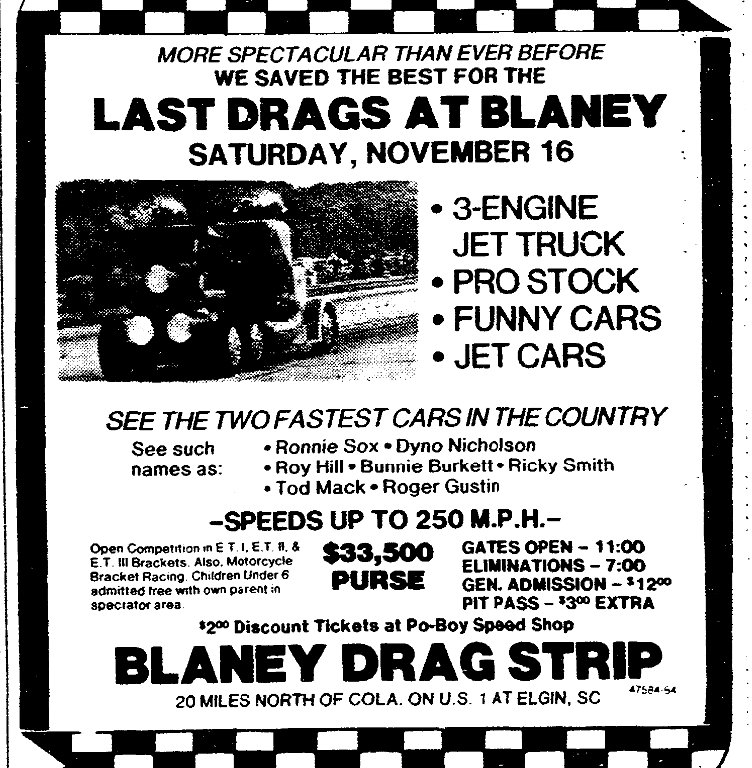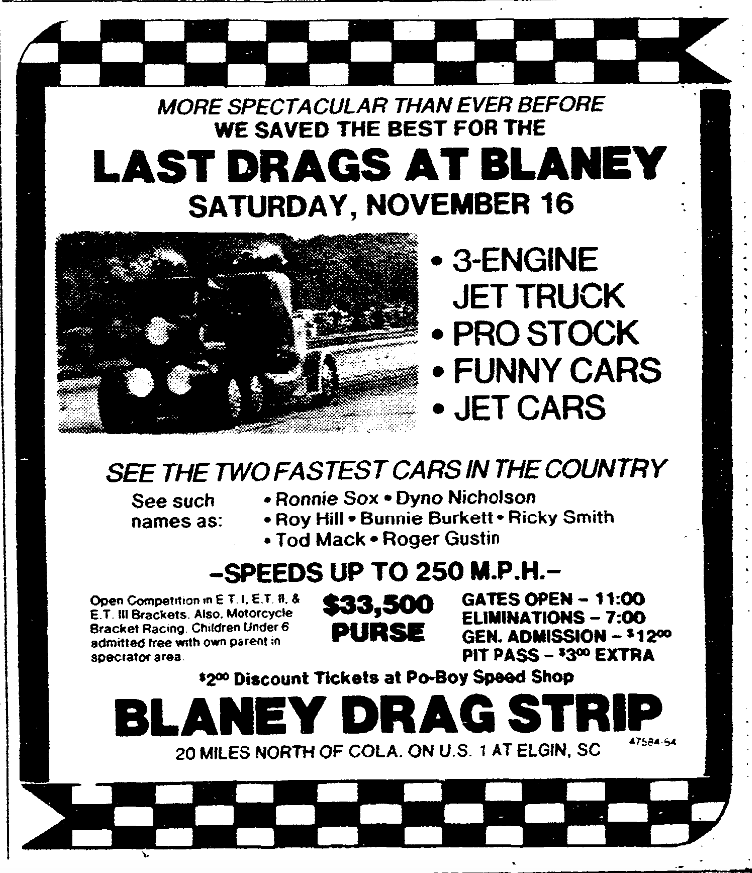 Open Competition in E. T. I., E. T. II & E. T. III Brackets. Also, Motorcycle Bracket Racing Children Under 6 admitted free with own parent in spector area.