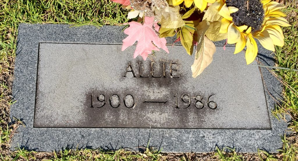 Allie Ross was counted in the census on 20 Apr 1910 in Wateree, Kershaw, South Carolina, USA as a 10-year-old, male (mistake in census), single, white, son. Also in the home was her father, Fline E Ross; her mother Sallie Ross; her siblings, Walter Ross, Paul Ross, Nancy Ross; his grandmother, Nancy Ross; and his cousin, Carrie Brown.