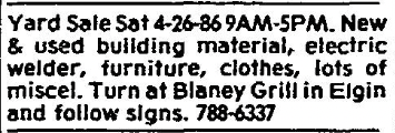 Yard Sale Sat 4-26-86 9AM – 5PM. New & used building material, electric welder, furniture, clothes, lots of miscel. Turn at Blaney Grill in Elgin and follow signs. 788-6337