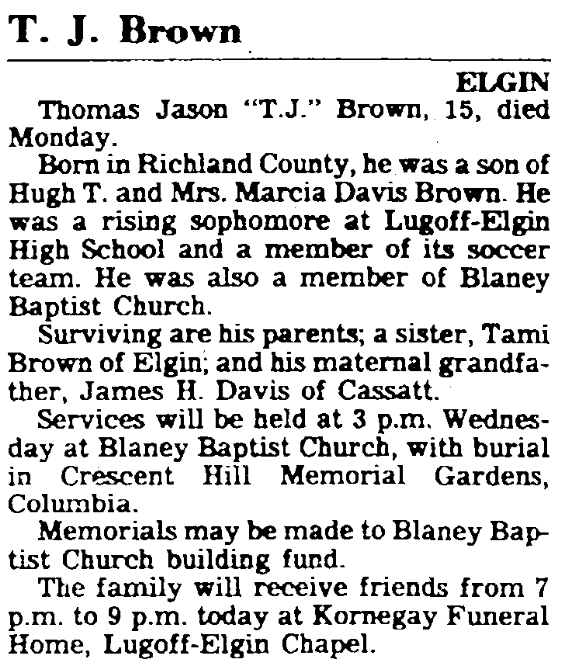 Born in Richland County, he was a son of Hugh T Brown and Mrs. Marcia Davis Brown. He was a rising sophomore at Lugoff-Elgin High School and a member of its soccer team. He was also a member of Blaney Baptist Church.