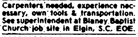Carpenters needed, experience necessary, own tools & transportation. See Superintendent at Blaney Baptist Church job site in Elgin, S. C. EOE