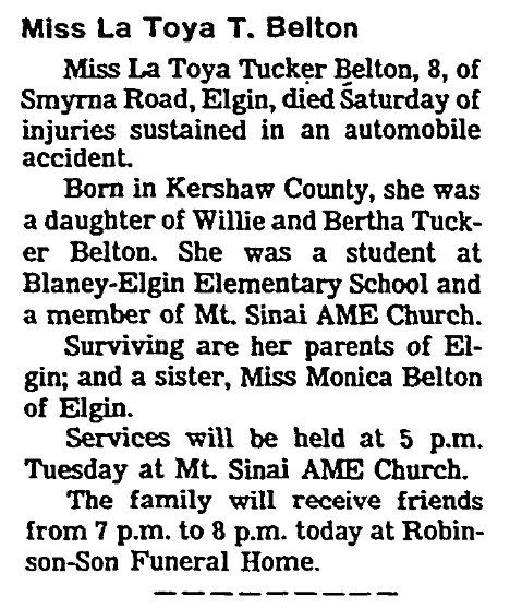 Miss La Toya Tucker Belton, 8, of Smyrna Road, Elgin, died Saturday, August 23, 1986, of injuries sustained in an automobile accident.