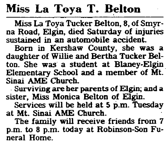 On, August 25, 1986, La Toya Tucker Belton was listed in the newspaper article “3 die on S. C. roads during weekend.”