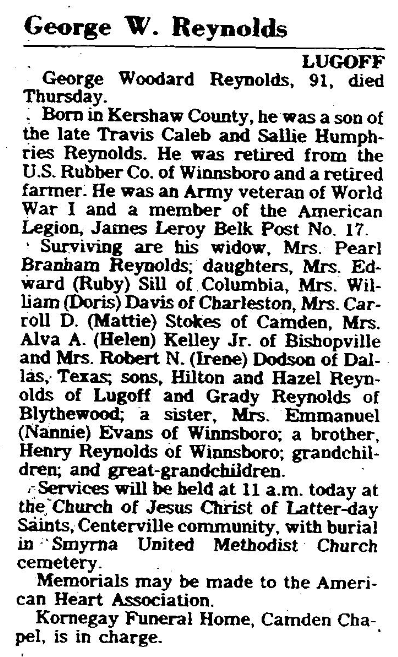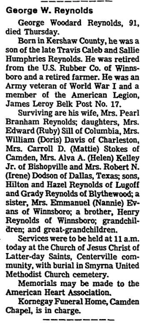 Surviving are his wife, Mrs. Pearl Branham Reynolds; daughters, Mrs. Edward Sill (Ruby Sill) of Columbia, Mrs. William (Doris) Davis of Charleston, Mrs. Carroll D. (Mattie) Stokes of Camden, Mrs. Alva A. (Helen) Kelley Jr. of Bishopville and Mrs. Robert N. (Irene) Dodson of Dallas, Texas; sons, Hilton Reynolds and Hazel Reynolds of Lugoff and Grady Reynolds of Blythewood; a sister, Mrs Emmanuel (Nannie) Evans of Winnsboro; a brother Henry Reynolds of Winnsboro; grandchildren; and great-grandchildren.