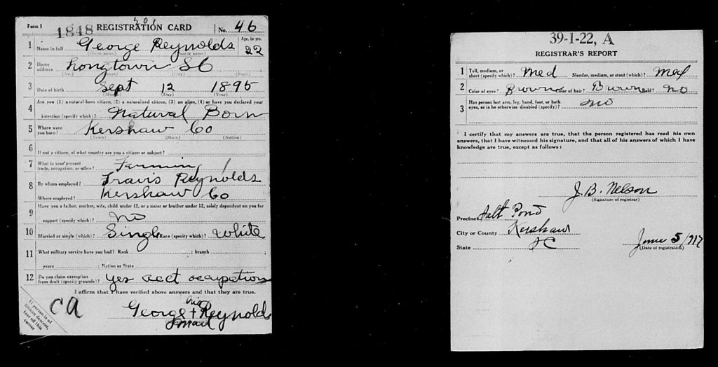 On 07 Jun 1917 in Kershaw, South Carolina, USA, George Reynolds completed his United States World War I Draft Registration Cards.