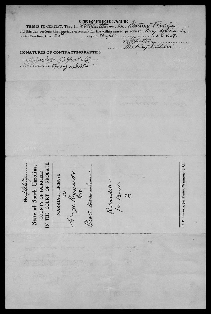 When he was 24, he married Pearl Branham on 20 Sep 1919 in Fairfield, South Carolina, USA.