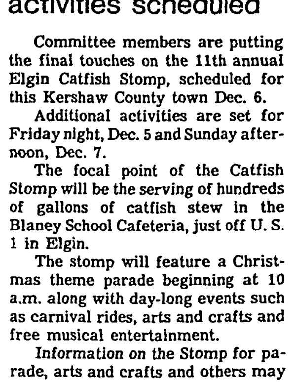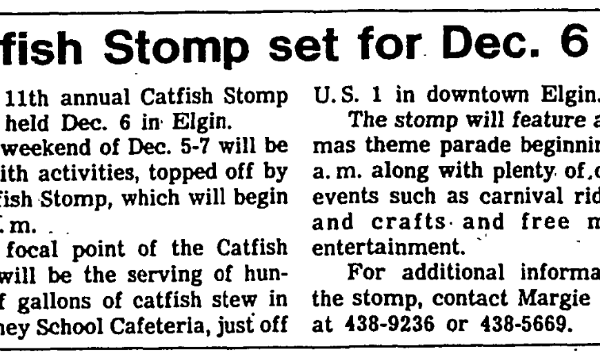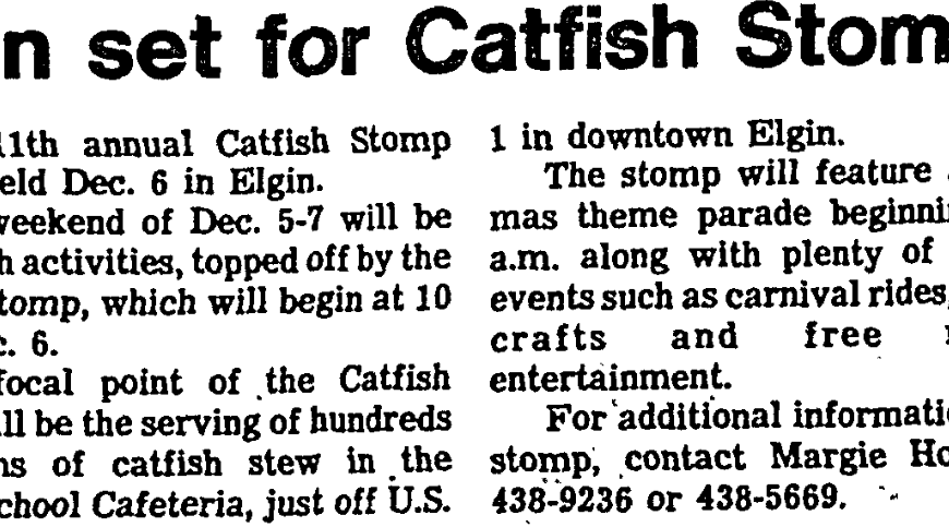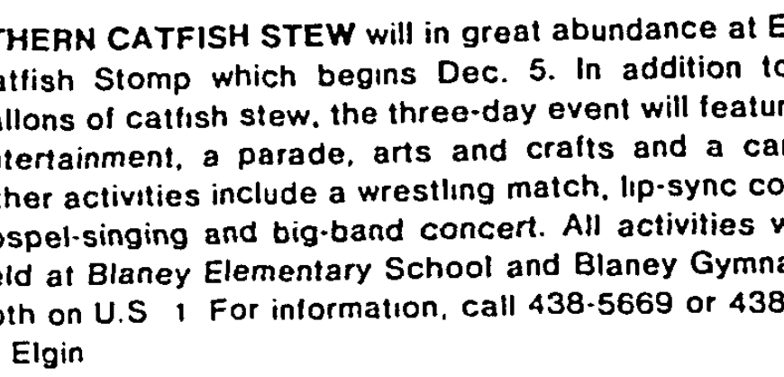 SOUTHERN CATFISH STEW will be in great abundance at Elgin’s Catfish Stomp which begins Dec. 5. In addition to 400 gallons of catfish stew, the three-day event will feature live entertainment, a parade, arts and crafts and a carnival. Other activities include a wrestling match, lip-sync contest, gospel-singing and big-band concert. All activities will be held at Blaney Elementary School and Blaney Gymnasium, both on … Continue reading Attractions