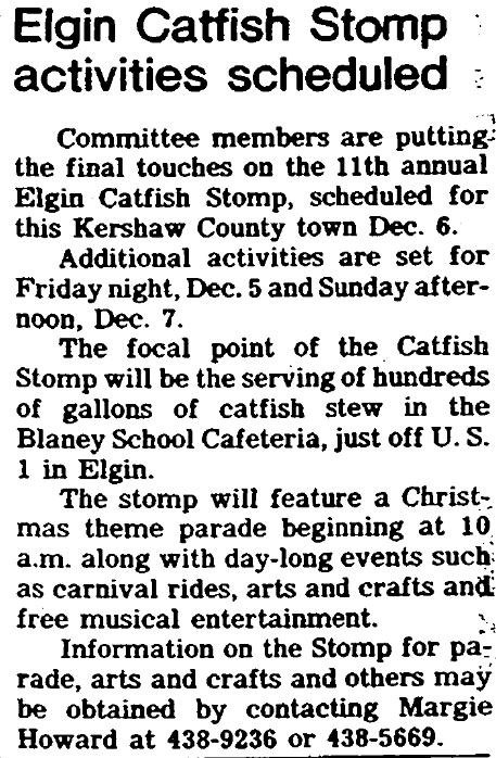 Committee members are putting the final touches on the 11th annual Elgin Catfish Stomp, scheduled for this Kershaw County town Dec. 6.