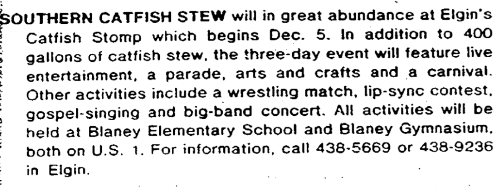 SOUTHERN CATFISH STEW will be in great abundance at Elgin’s Catfish Stomp which begins Dec. 5. In addition to 400 gallons of catfish stew, the three-day event will feature live entertainment, a parade, arts and crafts and a carnival. Other activities include a wrestling match, lip-sync contest, gospel-singing and big-band concert. All activities will be held at Blaney Elementary School and Blaney Gymnasium, both on U. S. 1. For information, call 438-5669 or 438-9236 in Elgin.