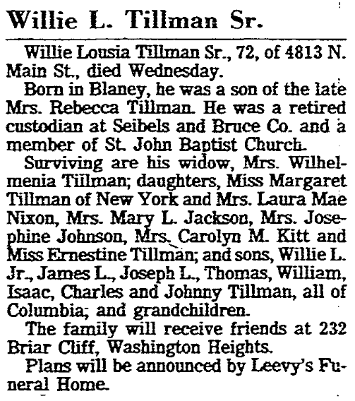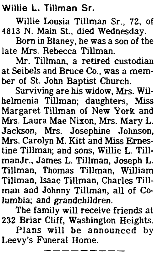 Surviving are his widow, Mrs. Wilhelmina Tillman; daughters, Miss Margaret Tillman of New York and Mrs. Laura Mae Nixon, Mrs. Mary L. Jackson, Mrs. Josephine Johnson, Mrs. Carolyn M. Kitt and Miss. Ernestine Tillman; and sons, Willie L. Tillman Jr., James L. Tillman, Joseph L. Tillman, Thomas Tillman, William Tillman, Isaac Tillman, Charles Tillman and Johnny Tillman, all of Columbia; and grandchildren.