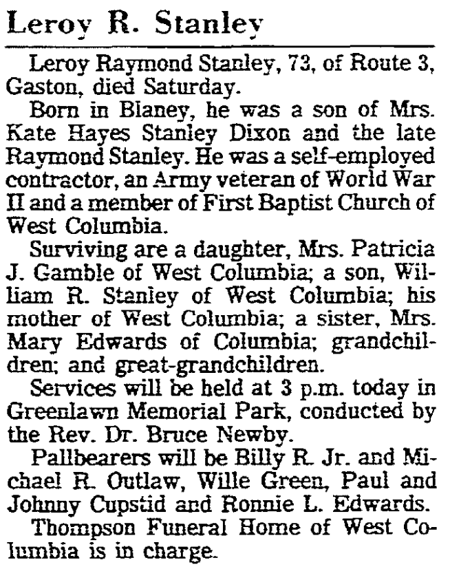 Born September 24, 1913 in Blaney, he was a son of Mrs. Kate Hayes Stanley Dixon and the late Raymond Stanley. He was a self-employed contractor, and Army veteran of World War II and a member of First Baptist Church of West Columbia.