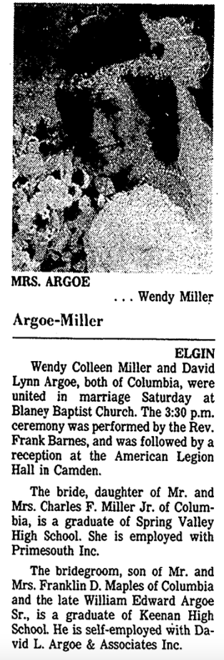 Wendy Colleen Miller and David Lynn Argoe, both of Columbia, were united in marriage Saturday at Blaney Baptist Church. The 3:30 p.m. ceremony was performed by the Rev. Frank Barnes, and was followed by a reception at the American Legion Hall in Camden.