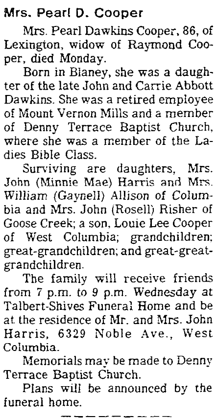Surviving are daughters, Mrs. John Harris (Minnie Mae Harris) and Mrs. William Allison (Gaynell Allison) of Columbia and Mrs. John Risher (Rosell Risher) of Goose Creek; a son, Louie Lee Cooper of West Columbia; grandchildren; great-grandchildren; and a great-great-grandchildren.