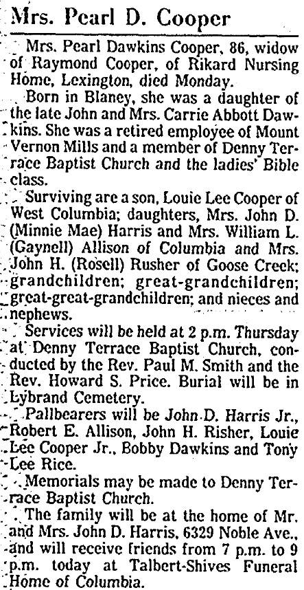Pearl Dawkins Cooper was born October 25, 1901 in Blaney South Carolina, a daughter of John Dawkins and Carrie Abbott Dawkins.
