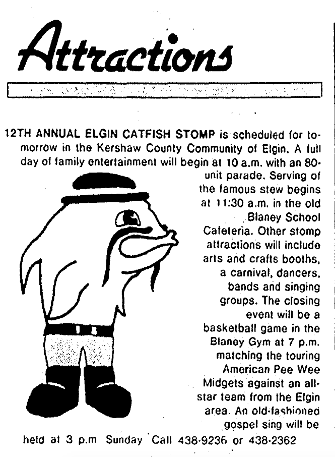 12TH ANNUAL ELGIN CATFISH STOMP is scheduled for tomorrow in the Kershaw County Community of Elgin. A full day of family entertainment will begin at 10 a.m. with an 80-unit parade. Serving of the famous stew begins at 11:30 AM in the old Blaney School Cafeteria. Other stomp attractions will include arts and crafts booths, a carnival, dancers, bands and singing groups. The closing event will be a basketball game in the Blaney Gym at 7 PM matching the touring American Pee Wee Midgets against an All-Star team from the Elgin area. An old fashioned gospel sing will be held at 3 PM Sunday call 438-9236 or 438-2362.