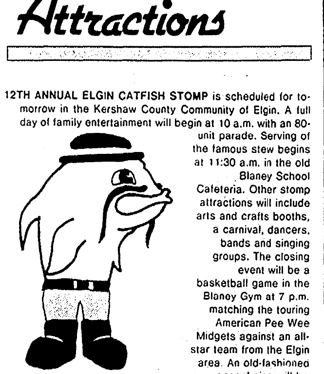 12TH ANNUAL ELGIN CATFISH STOMP is scheduled for tomorrow in the Kershaw County Community of Elgin. A full day of family entertainment will begin at 10 a.m. with an 80-unit parade. Serving of the famous stew begins at 11:30 AM in the old Blaney School Cafeteria. Other stomp attractions will include arts and crafts booths, a carnival, dancers, bands and singing groups. The closing event will be a basketball game in the Blaney Gym at 7 PM matching the touring American Pee Wee Midgets against an All-Star team from the Elgin area. An old fashioned gospel sing will be held at 3 PM Sunday call 438-9236 or 438-2362.