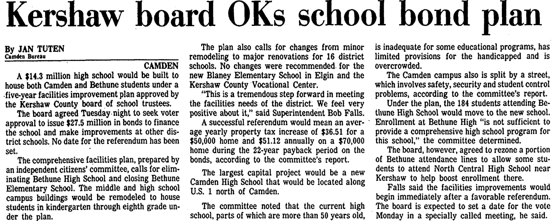 Falls said the facilities improvements would begin immediately after a favorable referendum. The board is expected to set a date for the vote Monday in a specially called meeting, he said.
