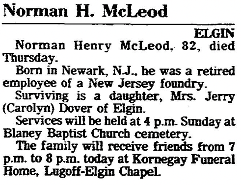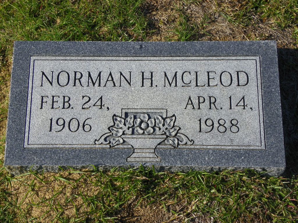 He died on 14 Apr 1988 in Elgin, Kershaw, South Carolina, USA. Norman Henry McLeod was buried on 17 Apr 1988 in Elgin, Kershaw, South Carolina, USA at Blaney Baptist Church Cemetery.