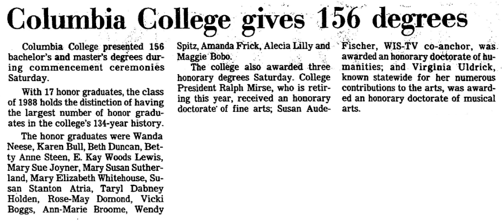 The college also awarded three honorary degrees Saturday. College President Ralph Mirse, who is retiring this year, received an honorary doctorate of fine arts, Susan Aude Fischer, WIS-TV co-anchor, was awarded an honorary doctorate of humanities; and Virginia Uldrick, known statewide for her numerous contributions to the arts, was awarded an honorary doctorate of musical arts.