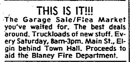 The Garage Sale/ Flea Market you’ve waited for. THe best deals around. Truckloads of new stuff. Every Saturday, 8 am-3pm. Main St., Elgin behind Town Hall. Proceeds to aid the Blaney Fire Department.