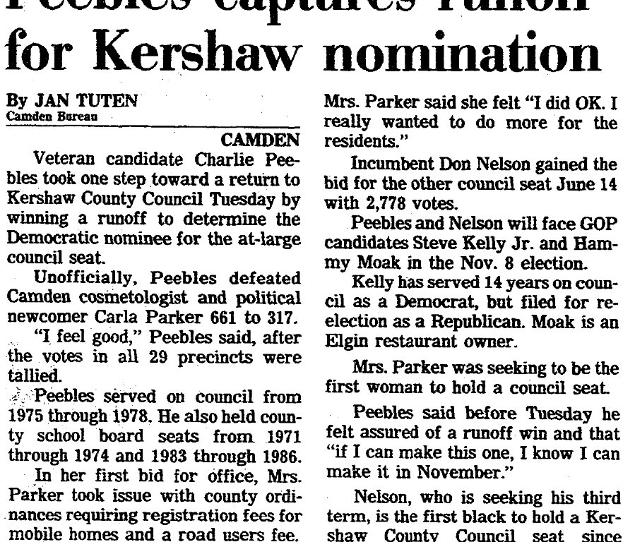 Veteran candidate Charlie Peebles took one step toward a return to Kershaw County Council Tuesday by winning a runoff to determine the Democratic nominee for the at-large council seat.