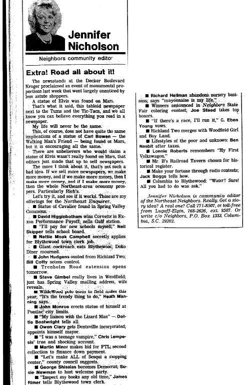 Jennifer Nicholson is community editor of the Northeast Neighbors. Really. Got a story idea? A real one? Call 771-8507, or toll-free from Lugoff-Elgin, 768-2626, ext. 8507. Or write c/o Neighbors, P.O. Box 1333, Columbia, S.C. 29202.