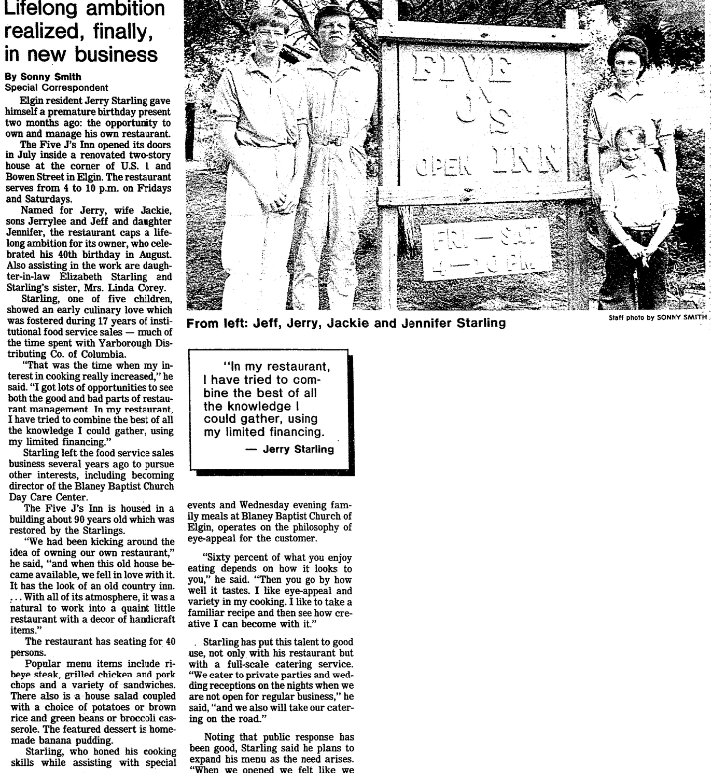 Lifelong ambition realized, finally, in new business By Sonny SmithSpecial Correspondent Elgin resident Jerry Starling gave himself a premature birthday present two months ago; the opportunity to own and manage his own restaurants. The Five J’s Inn opened its doors in July inside a renovated two-story hour at the corner of U. S. 1 and Bowen Street in Elgin. The restaurant serves from 4 to … Continue reading Elgin family pitching in at restaurant