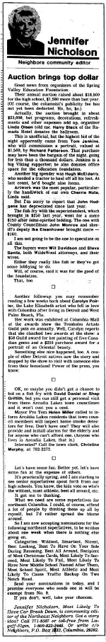 Their annual auction raised about $18,500 for the high school, $1,500 more than last year. (Of course, the columnist’s publicity fee has not yet been deducted. Ho, ho, ho.)