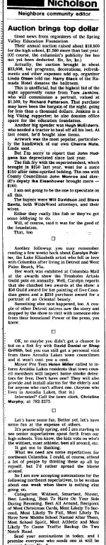 Their annual auction raised about $18,500 for the high school, $1,500 more than last year. (Of course, the columnist’s publicity fee has not yet been deducted. Ho, ho, ho.)