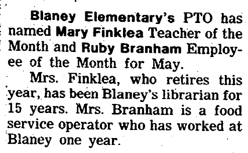 Mrs. Finklea, who retires this year, has been Blaney’s librarian for 15 years. Mrs. Branham is a food service operator who has worked at Blaney one year.